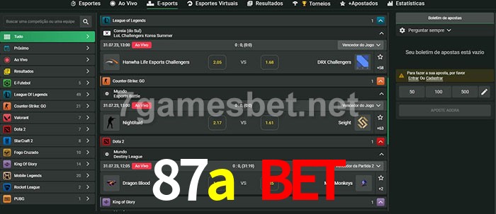 O 87a bet oferece uma grande seleção de opções de apostas em e-sports com probabilidades competitivas